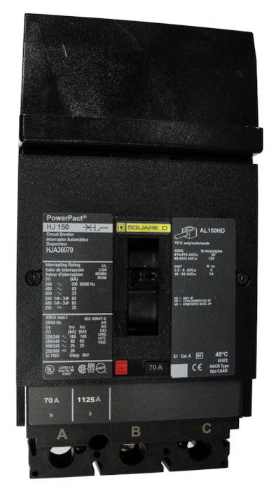 --HJA Frame Style, PowerPact, Molded Case Circuit Breaker, Thermal Magnetic Non-interchangeable Trip Unit, 70 Ampere at 40 Degree Celsius, 3 Pole, Interrupting Ratings: 100 Kiloampere @ 240 VAC, 65 Kiloampere @ 480 VAC, 25 Kiloampere @ 600 VAC, 20 Kiloampere @ 250 VDC, Load End Terminals Standard