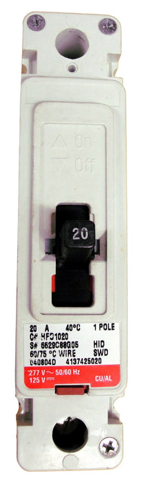 HFD Frame Style, Molded Case Circuit Breaker, Thermal Magnetic Non-interchangeable Trip Unit, High Interrupting Capacity, 20 Ampere at 40 Degree Celsius, 1 Pole, 600VAC @ 50/60HZ, Interrupting Ratings: 100 Kiloampere @ 240VAC, 65 Kiloampere @ 480VAC, 25 Kiloampere @ 600VAC, 22 Kiloampere @ 250VDC, Line and Load End Terminals Standard.